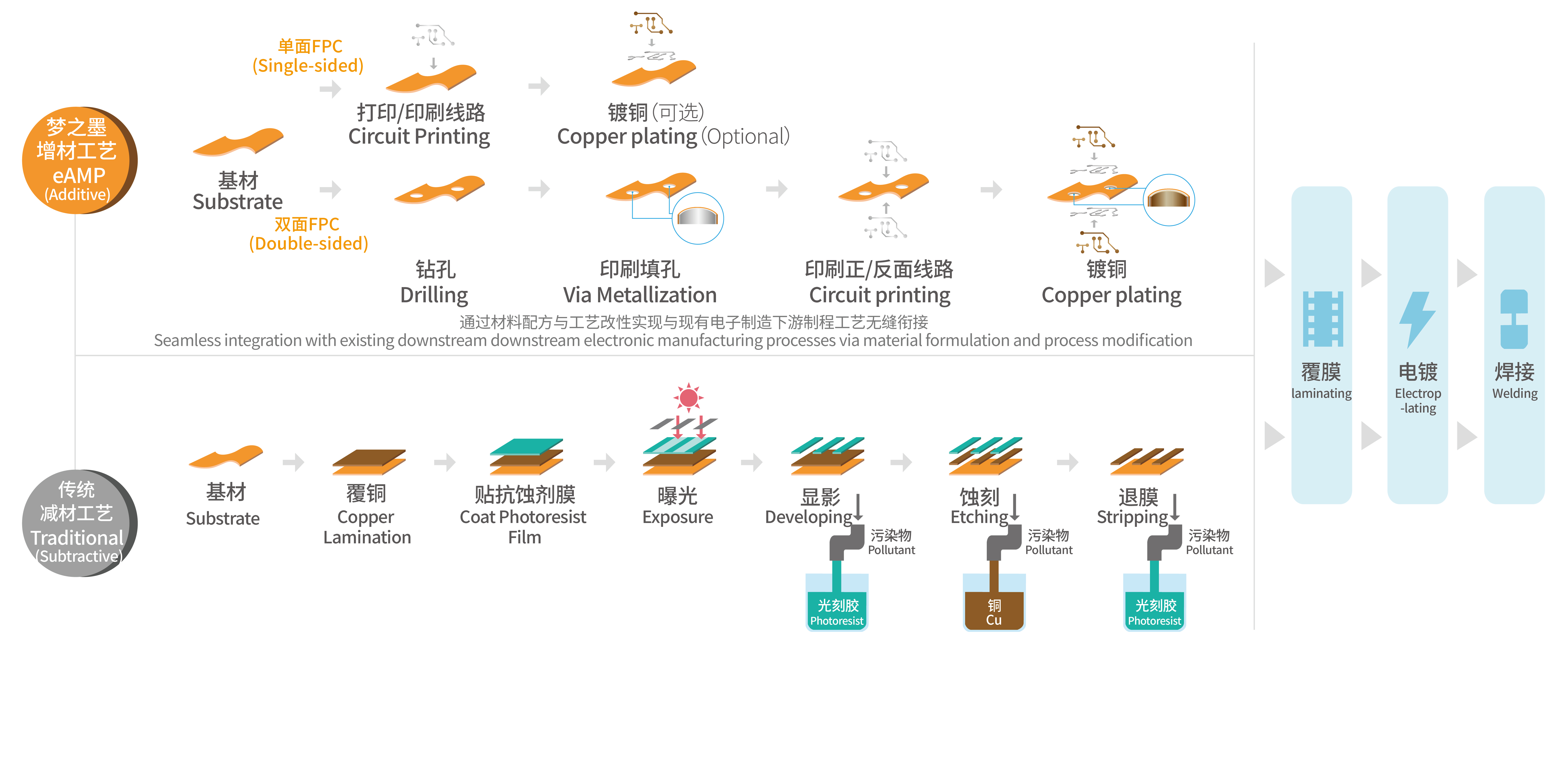夢之墨電子增材制造技術eAMP:通過將功能性導電材料印刷在絕緣基材表面形成極薄的導電圖案種子層(3-5μm),再根據需要進行鍍銅(銅層10μm以上)形成導電層,并且與后道表面處理,高溫焊接的工序做到無縫鏈接。相較于傳統工藝,eAMP技術簡化了生產工藝、減少了原材料的浪費、降低了生產過程使用能耗,并剔除了傳統蝕刻法中含大量廢水排放的高污染制程,具有輕量化、綠色環保、低碳等天然優勢。